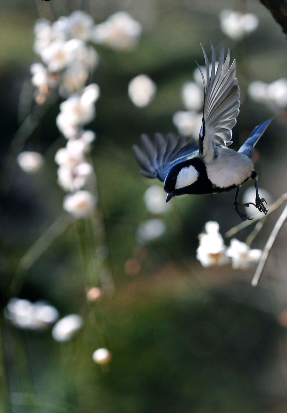 在低垂的梅花中飞舞的白脸山雀