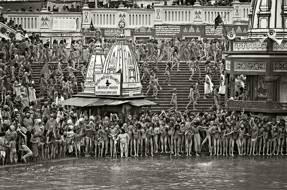 拍摄的是在印度的哈里瓦举行的叫做大壶节的节日。这个节日是12年举办一次的世界上最大的宗教节日。拍摄这张照片的当天,有1200万人前来参观,在恒河中沐浴。