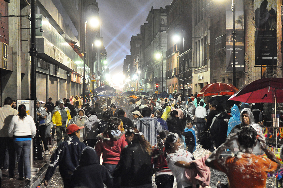 拍摄的是在独立纪念日,游行在墨西哥城历史中心街区的人们。那天虽然下着雨,活动期间人们相互泼泡沫。节日洋溢着反光灯和祝福之声。