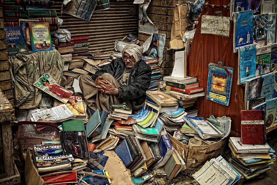 拍摄于位于伊拉克的巴格达著名的旧书市场。在伊拉克有很多人像照片里的男人一样,靠出售旧书为生。我认为这张照片的成功之处在于,表达出了坐在旧书堆中盯着来买书的行人的男人的心情。