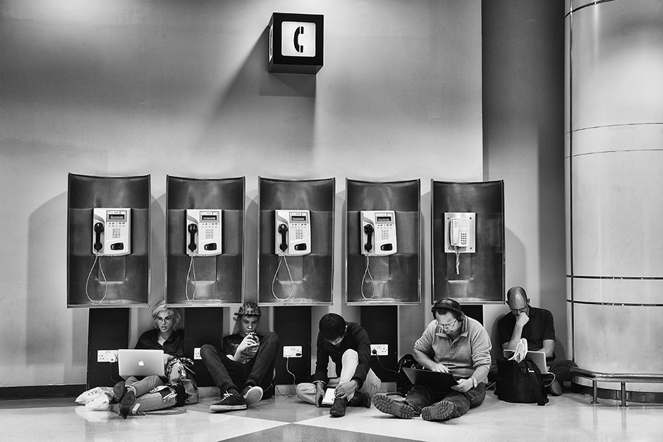由于“交流”过剩我们渐渐不能与围绕我们的世界建立良好的关系...。 今年2月份的某一天、从阿布扎比归来的途中、到达多哈机场。我注意到有人想进行“交流”,我情不自禁地从包里拿出相机,拍摄了这张照片。那是很刺激的构图。对于我来说,可以认为它表现了我们在历史上的某个瞬间所理解的“交流”的概念。我认为它很完美。