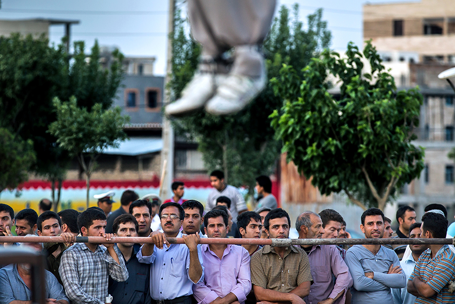 伊朗可能是执行死刑较多的国家。基本上是在公共场合,住宅区域,于早上执行绞刑,各个年龄段、各个阶级的男性、女性中的很多人来看绞刑的执行。这些照片拍摄于2012年6月28日的德黑兰,两个人被执行了绞刑。这两个人由于强奸4名女性、交易3t的麻药而被处以死刑。