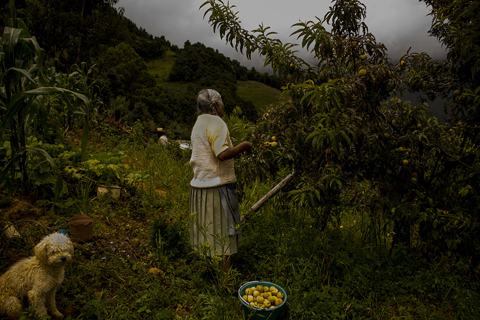 这张照片是在瓦哈卡州最高山脉之一被称为“Latuvi”上拍摄的。那里是瓦哈卡州贫困的地区之一,居民以收获苹果和桃子支撑生活,把收获的东西拿到街上去卖。几乎一天的时间都是被雾和雨水覆盖。那里是湿润的环境,由于湿度大和强大的自然环境,地面很滑,所以拍摄人们做事的样子、种树的样子和在山上的斜坡上收获样子等照片是很难的。