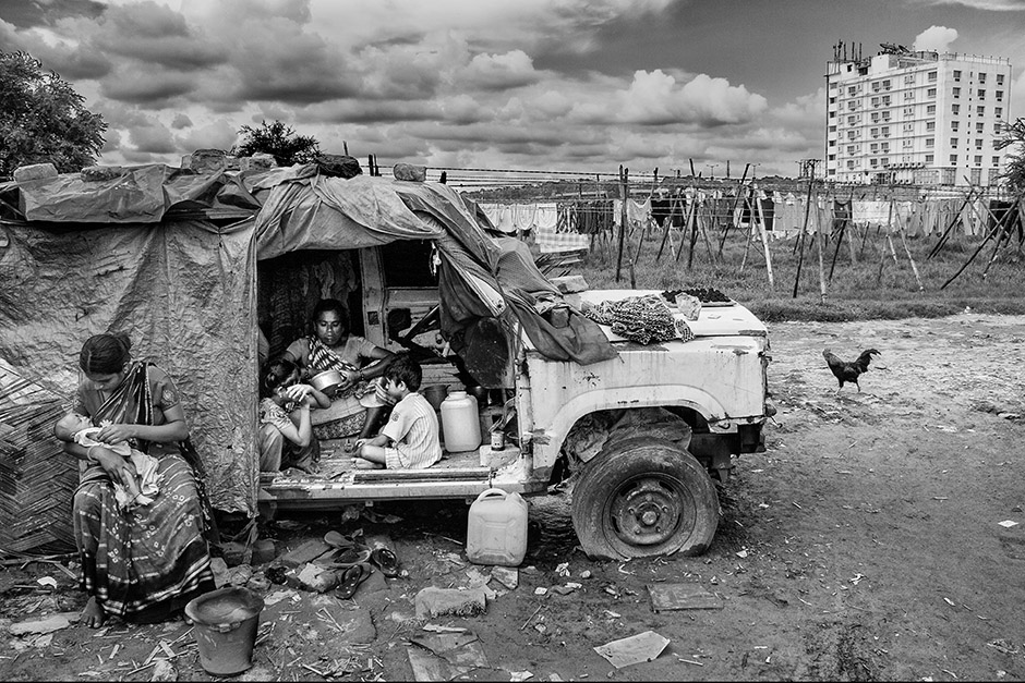 这张照片是在发展中城市加尔各答的东部周边拍摄的。那里正在建设新城市区划,分单元出售的住宅陆续成为街景。但是,还是照顾不到像照片中这个贫困的移民劳动者的家族一样,生活在社会底层的人们。因此作为避难所,他们必须在此忍受着安排决定住处。这个家庭则把使用过丢掉的吉普车作为避难所。他们非常有礼貌,很高兴地配合拍摄。