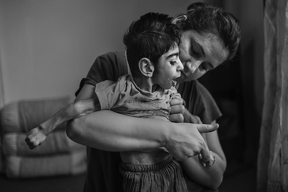 “母亲至上”是2013年11月在伊朗-萨南达季瑞拍摄的,Semko 3岁半。他患有名为小头症的疾病。这组照片描写了一个年轻母亲和她生病的孩子的困难生活。这个年轻母亲和她的丈夫离婚后,一个人工作。他们离婚的原因是因为Semko的疾病。她拼命工作照顾着患有非常严重疾病的儿子。她不能离开家让儿子一个人孤单无依。他们没有任何金钱援助。这组照片拍摄的是伊朗库尔德斯坦州的萨南达季市的Shaikhan街道,是市内贫困地区之一,我在一家非常小的旧房子里拍摄了这张照片。