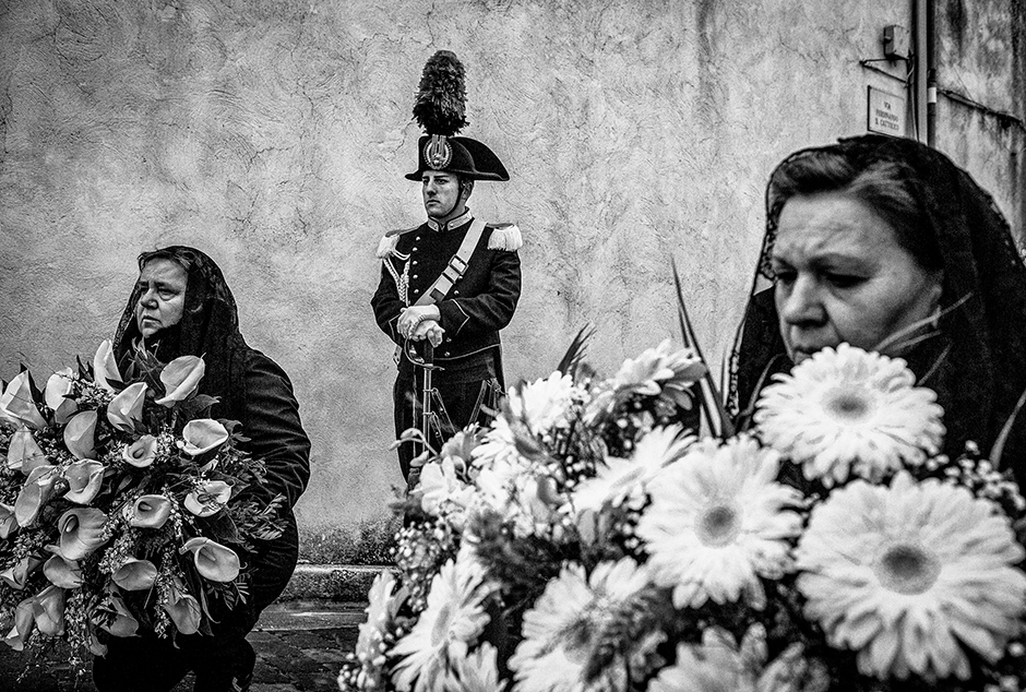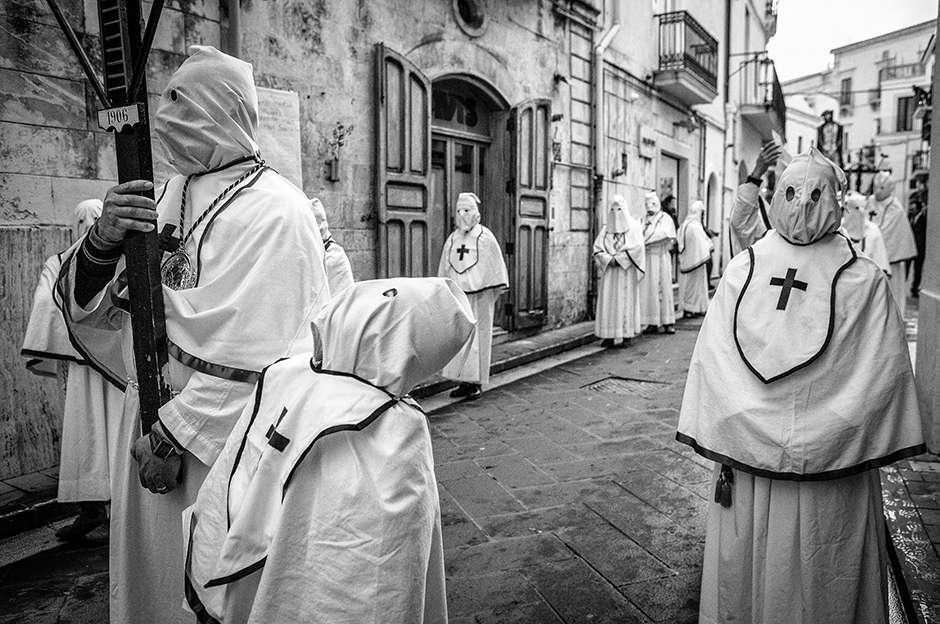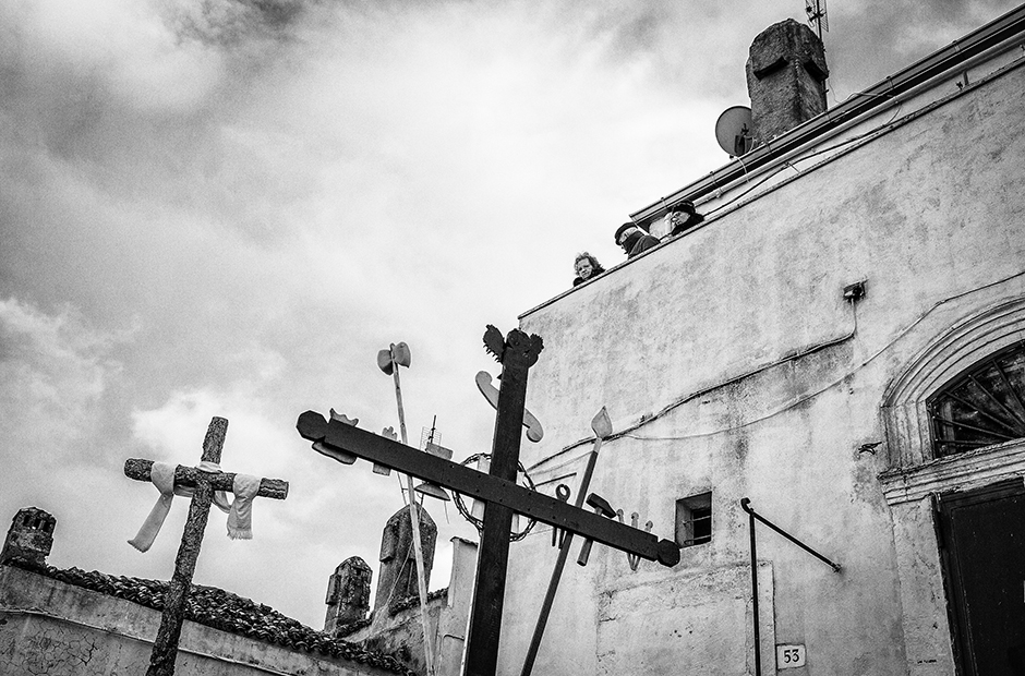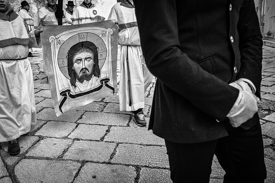 如今仪式和古代的传统由于社会经济的变化而受到了威胁。节日面临着失去它的正当性,永远消失的危险 。所以我想讲述这些地方和那里的人的故事以及灵魂:爱和热情、痛苦和愤怒、喜悦和忧伤。起源是消失在古代云雾中的由基督教徒和异教徒的形象而编的神话。 到了日落,死去的耶稣像和人们一起向旧街市出发,形成了队列。然后,穿着黑色衣服的女性、当地的政治家、神秘的团体成员、耶稣受难的雕像和象征以及代表不同人物的小组陆续加入队列。这个理想的“十字架路”间人们离开家,对死亡的耶稣表示自己的哀悼之情。仪式与所有的居民都有关,这个中世纪的村子暗示着更进一步的静谧。