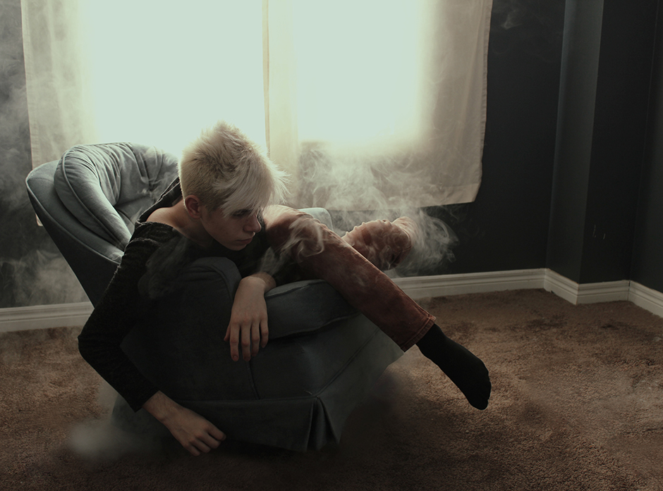 这个作品是在我朋友家中的客厅里拍摄的。我的朋友和我将所有的家具转移到不碍事的地方,并将扶手椅置于中央,窗户的前面,以便更柔和自然的光线能够进入。由于从放在一边的烟雾机里出来的烟不断地发生变化,我必须不间断地拍摄,这个拍摄结束的时候我留下了100多张照片。