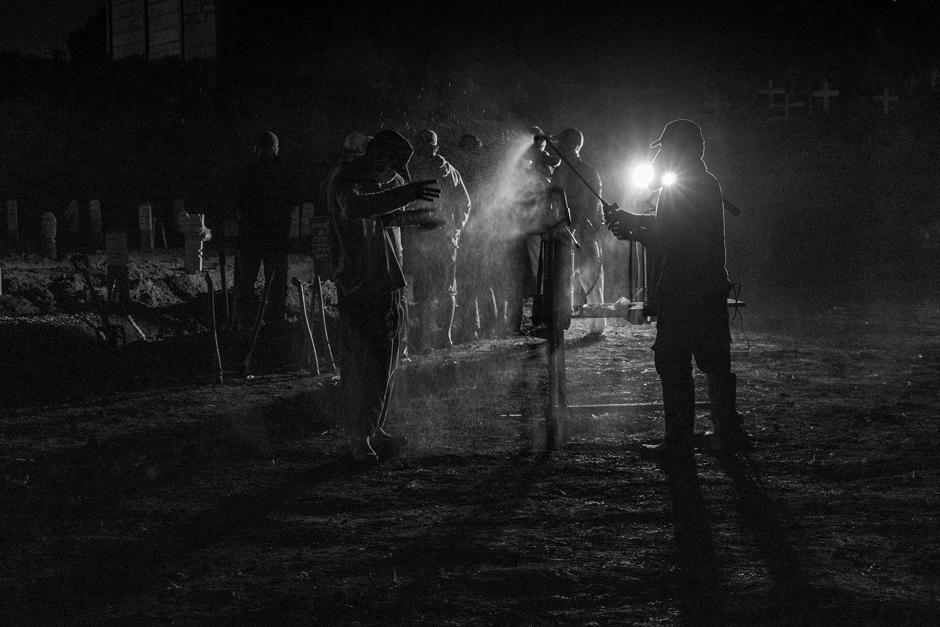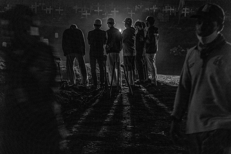 在此次大流行期间,殡仪馆的工作人员每天至少要埋葬30-50具被确认或有可能感染Covid-19的人的遗体。因为无法得到需埋葬遗体的确切数量,他们每天的大部分时间都被要求在原地待命,等待灵车的到来。